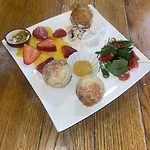 De gasten kunnen van hun ochtendmaaltijd in de tuin genieten. De drukke bar is ook beschikbaar.